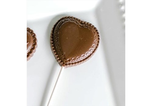 Solid chocolate heart shaped lollipops with a lace cut design bordering the heart.