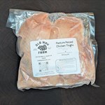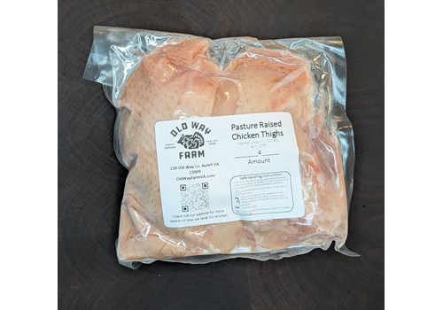 Delicious Pasture Raised bone in and skin on chicken thighs. Our chicken is moved to fresh pasture every day and supplemented with a non-GMO feed.