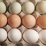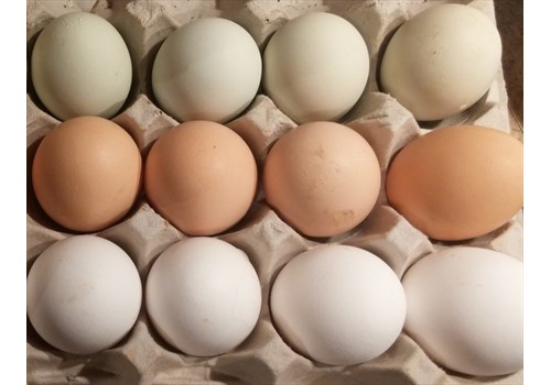Large Fresh Brown and Green Eggs. Our hens are free ranging eating bugs and grass! They also enjoy all the garden trimmings. When we enjoy dinner outside nice days Mickey feeds them right from his plate! Spoiled girls. The breeds we have on the farm for laying hens are: Rhode Island Red, New Hampshire Red, Delaware, Americanna, and Austrolop