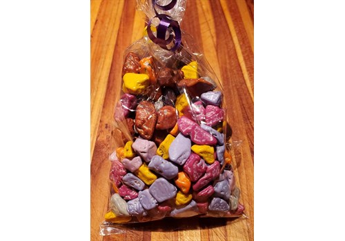 Chocolate rocks in milk chocolate. Multiple colors and shapes/sizes in each bag. Comes in a 5 oz bag size.